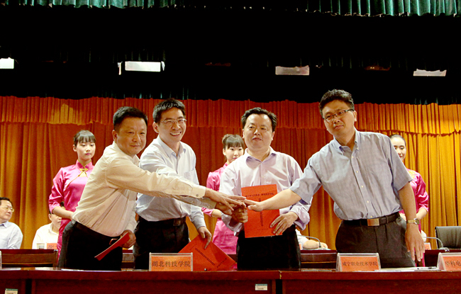 上图:校长吴基良、副市长镇方松分别代表湖北科技学院和咸宁市政府签署协议 摄影/杨明