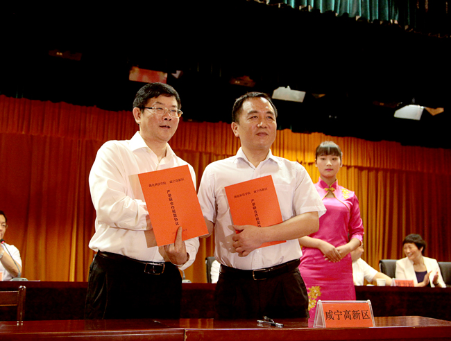 签约仪式在温泉校区图书馆学术报告厅举行。市委书记任振鹤、市长丁小强,省科技厅副厅长杜耘,市委常委、统战部长张方胜,副市长镇方松、蔡光兴,市经济开发区工委书记、管委会主任汪凡非,校党委书记彭育园、校长吴基良,省发改委工业处处长蔡铂,咸宁职业技术学院党委书记王继成,市政府秘书长夏福卿,以及武汉大学、华中科技大学特邀嘉宾,其他主要校领导,各县市区主要负责人、学校相关院部负责人、200余名企业代表等出席大会。市长丁小强主持仪式,校长吴基良、副市长镇方松分别代表学校和地方政府签署协议。