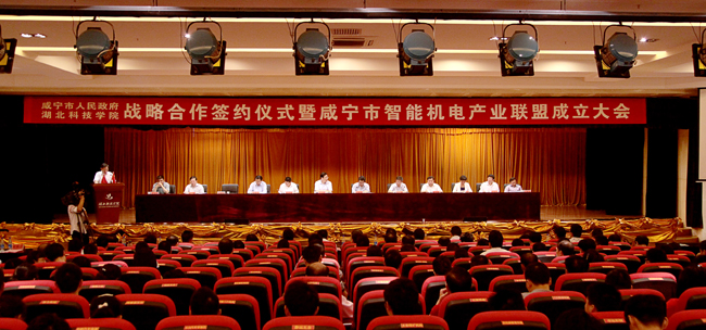 签约仪式之后,“智能机电咸宁市协同创新中心”、“咸宁市智能机电产业联盟”宣告成立。“中心”由市政府、湖北科技学院、华中科技大学、咸宁职业技术学院、湖北思索动力科技有限公司共建,“联盟”由包括湖北科技学院在内的20家单位发起。二者均旨在促进智能机电技术产业的跨越式、集群式发展,提升湖北省咸宁市机电行业的科技创新能力,优化产业结构,提高湖北科技学院的教学质量和科研水平,为智能机电技术产业培养拔尖创新人才,实现学校、行业产业和区域经济的共同进步。当天下午,“咸宁市智能机电产业联盟”第一次全体会议暨智能机电产业培训在温泉校区教3-402报告厅举行。