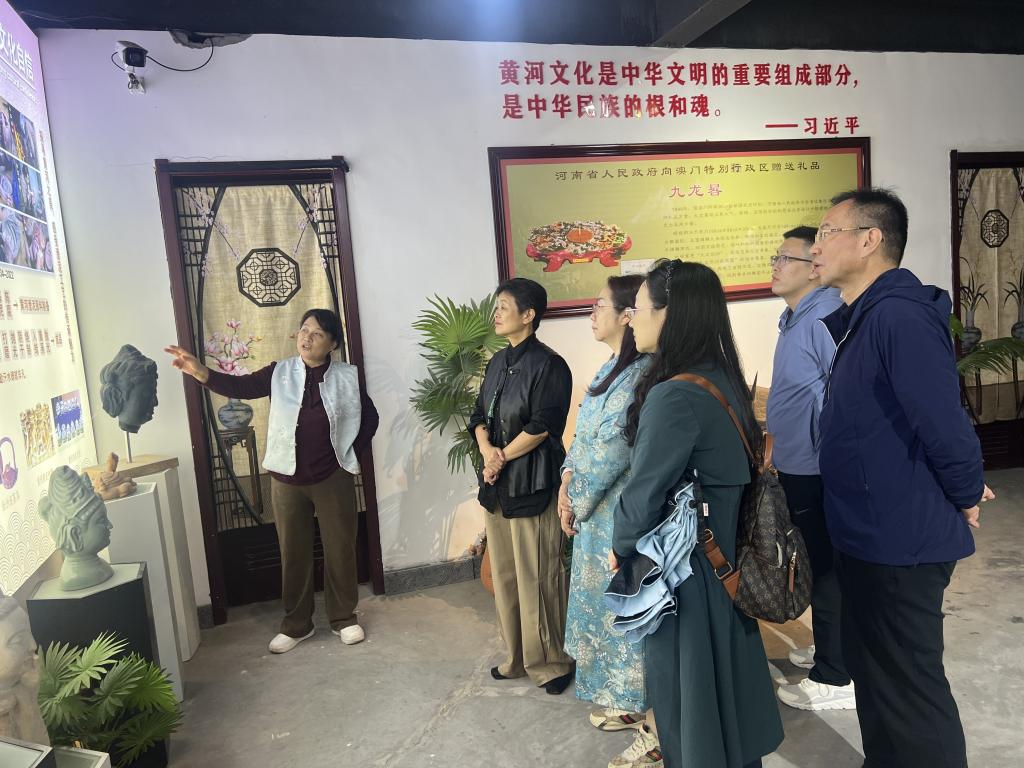在河南省非物质文化遗产“黄河澄泥砚”传承人、河南省工艺美术大师王玲的陪同下,考察团走进了黄河澄泥砚工作室和黄河金沙泥艺术研究所。王玲详细介绍了澄泥砚技艺的传承与发展历程。澄泥砚以其细腻的质地和独特的制作工艺,被誉为“文房瑰宝”。