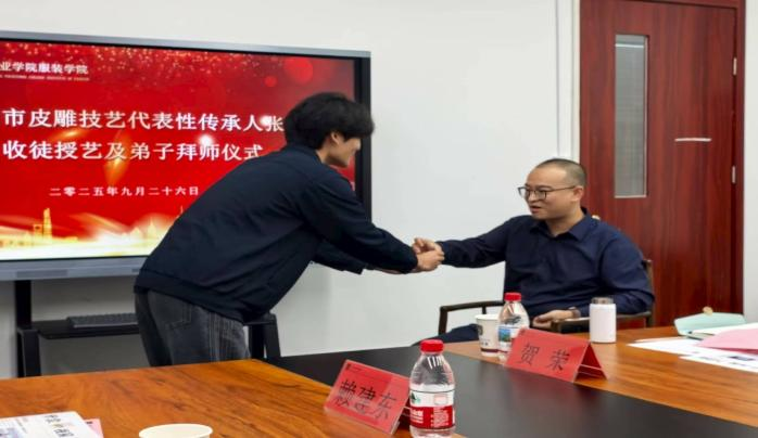 随后,双方在会议室召开了座谈交流会。该会议由服装学院阮肇民院长主持,河南省文化和旅游厅原一级巡视员、河南省文旅公共服务专家委员会主任崔为工和副主任康洁、郑州市非物质文化遗产保护和文旅文创融合发展中心主任李桂玲等领导出席了该会议。与会人员共同见证了庄重而温馨的“皮雕非遗技艺传承拜师仪式”,展现了非遗技艺代代相传的师承精神与文化责任。阎进副院长、薛瑞副书记和李桂玲主任分别就学院办学特色、育人模式及非物质文化遗产学院的建设经验进行了分享。何岳球主任表示郑州市非物质遗产保护和文旅文创融合发展中心、非物质文化遗产研究院、河南机电职业学校院服装学院等单位是守护和活化这些文化瑰宝的重要阵地,有着丰富的实践经验和深刻的真知灼见。通过这次调研学习,让我们亲身感受到非遗的魅力,深入了解了郑州在非遗保护、传承、创新以及融入现代生活方面的卓越成就和宝贵经验。接着,介绍了鄂南文化研究中心在地方文化研究、铸牢中华民族共同体意识等方面的实践经验。双方围绕“非遗+教育”“文化+产业”等主题展开了讨论,就非遗技艺如何更好地融入现代教育体系、如何实现产教研融合等问题进行了深入交流。
